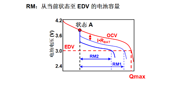 下面介紹的是電池的剩余容量。剩余容量是指當前狀態放到EDV的電池容量,EDV也就是終止放電電壓。圖中當前狀態A在一個給定的電流下進行放電,放電到3.0V的時候,對應的剩余容量從圖中標出的就是R1。那如果在狀態A的情況下,同比較大的電流放電,這個時候這個曲線的位置會比開路電壓更低一點,也會比剛才的小電流放電的RM1對應的位置更低一點,那這個時候得到的剩余容量是RM2。RM2和RM1對應的放電曲線它們的區別在于使用的放電電流是不一樣的,放電電流越大,曲線的位置越低,剩余容量就越小,所以電池的剩余容量是與放電速率有關的,不同的電流下面電池的剩余容量是不一樣的。有的用戶在電池的實際使用過程中在放電的情況下,會發現電池的容量由少變多,他感到不可理解,實際這里可以解釋一下,這種情況是由于放電電流的變化造成的,當我們看到電池容量由少變多的情況,這個通常是由于放電電流突然變小造成的,因為在不同的電流下電池可以放出的容量是不一樣的,當放電電流變小的時候,它可以放出的容量是可以增加的。